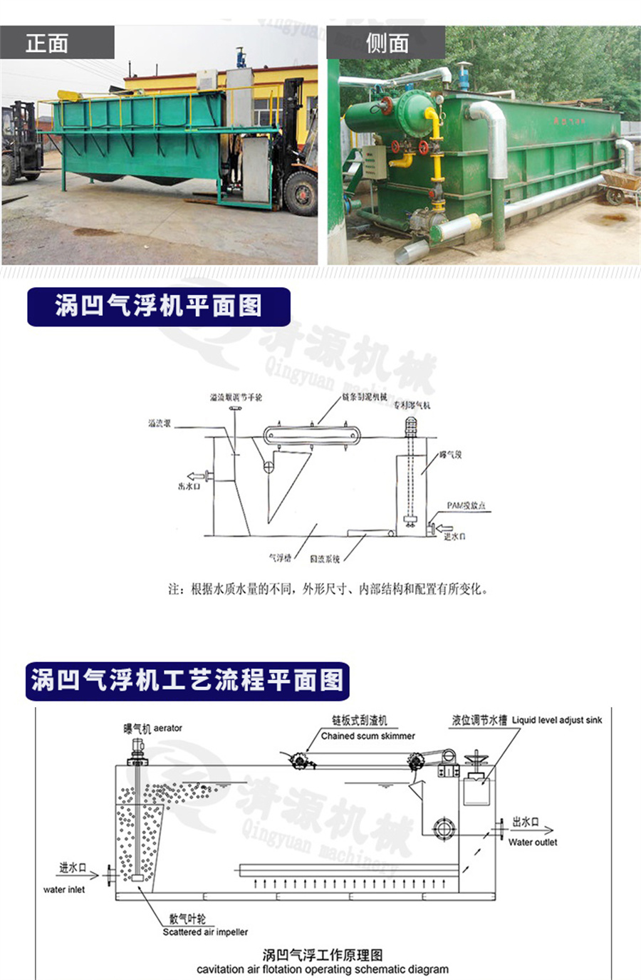 此外,我公司不仅生产涡凹气浮机、还生产竖流式溶气气浮机、地埋式污水处理设备、污泥压滤机、固液分离设备、造纸设备等其他设备。