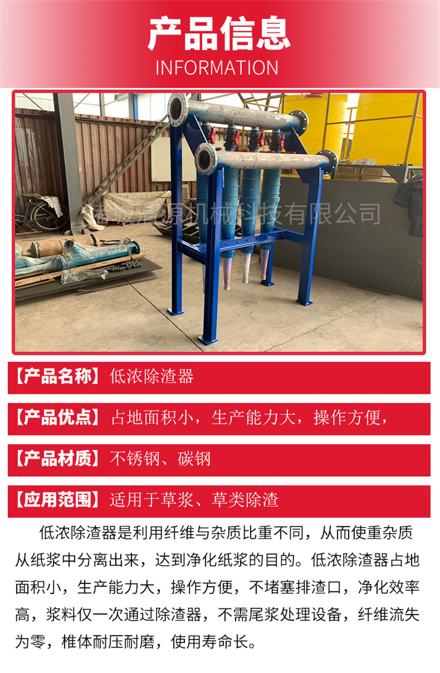 概述:ZDC系列双锥低浓除渣器是利用纤维与杂质比重不同,从而使重杂质从纸浆中分离出来,达到净化纸浆的目的。低浓除渣器占地面积小,生产能力大,操作方便,不堵塞排渣口,净化效率高,浆料仅一次通过除渣器,不需尾浆处理设备,纤维流失为零,椎体耐压耐磨,使用寿命长。