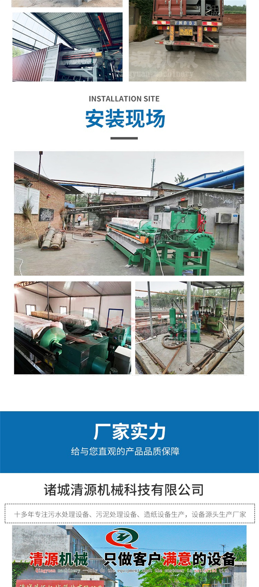 三、优点:板框式压滤机的优点是:结构较简单,操作容易,运行稳定,保养方便;过滤面积选择范围灵活,占地少;对物料适应性强,适用于各种中小型污泥脱水处理的场合。