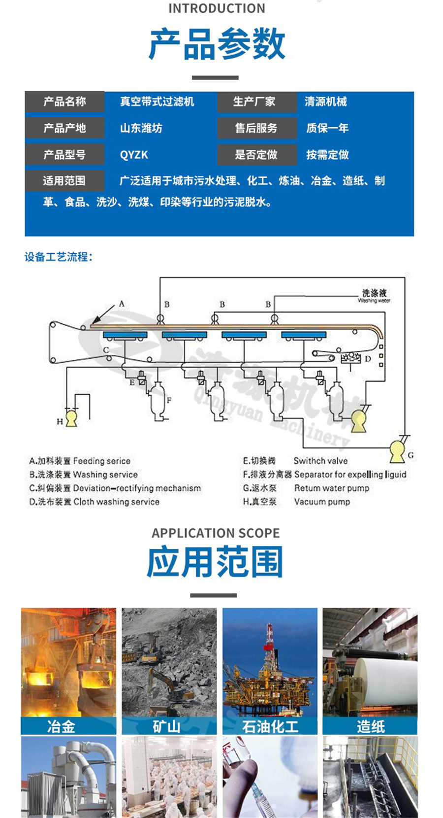 真空带式过滤机是一种自动化程度高的新型过滤设备,该机以过滤布或滤网为介质,使料浆水平布置于过滤介质之上,充分利用料浆重力和真空吸力实现固液分离。连续水平带式真空过滤机可适用于多种浓度条件下的物料,过滤效率高,因而被重多工业界优先采用。