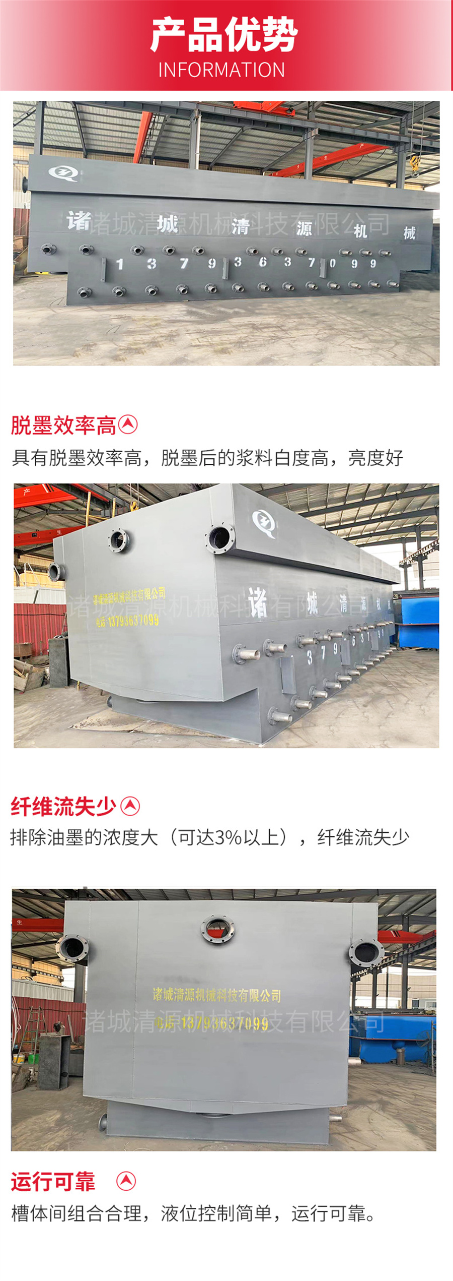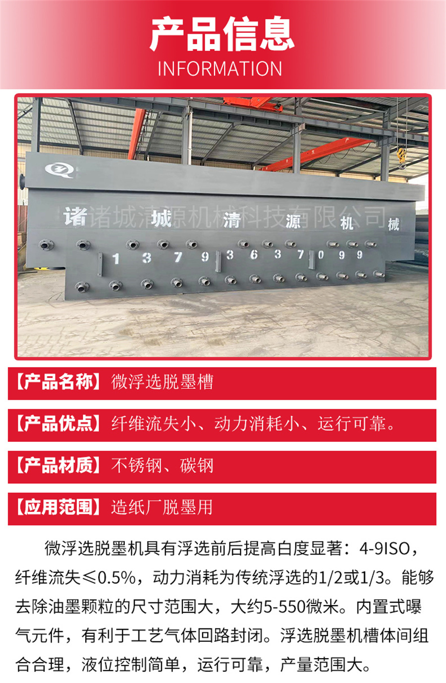 微浮选脱墨机具有浮选前后提高白度显著:4-9ISO,纤维流失≤0.5%,动力消耗为传统浮选的1/2或1/3。能够去除油墨颗粒的尺寸范围大,大约5-550微米。内置式曝气元件,有利于工艺气体回路封闭。浮选脱墨机槽体间组合合理,液位控制简单,运行可靠,产量范围大。