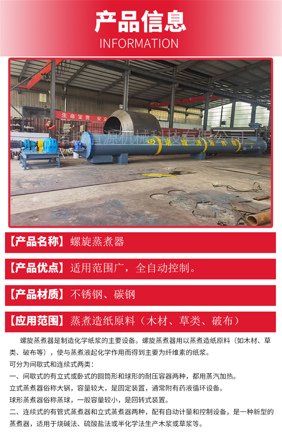 诸城清源机械科技有限公司生产的螺旋蒸煮器用以蒸煮造纸原料(如木材、草类、破布等),使与蒸煮液起化学作用而得到主要为纤维素的纸浆。