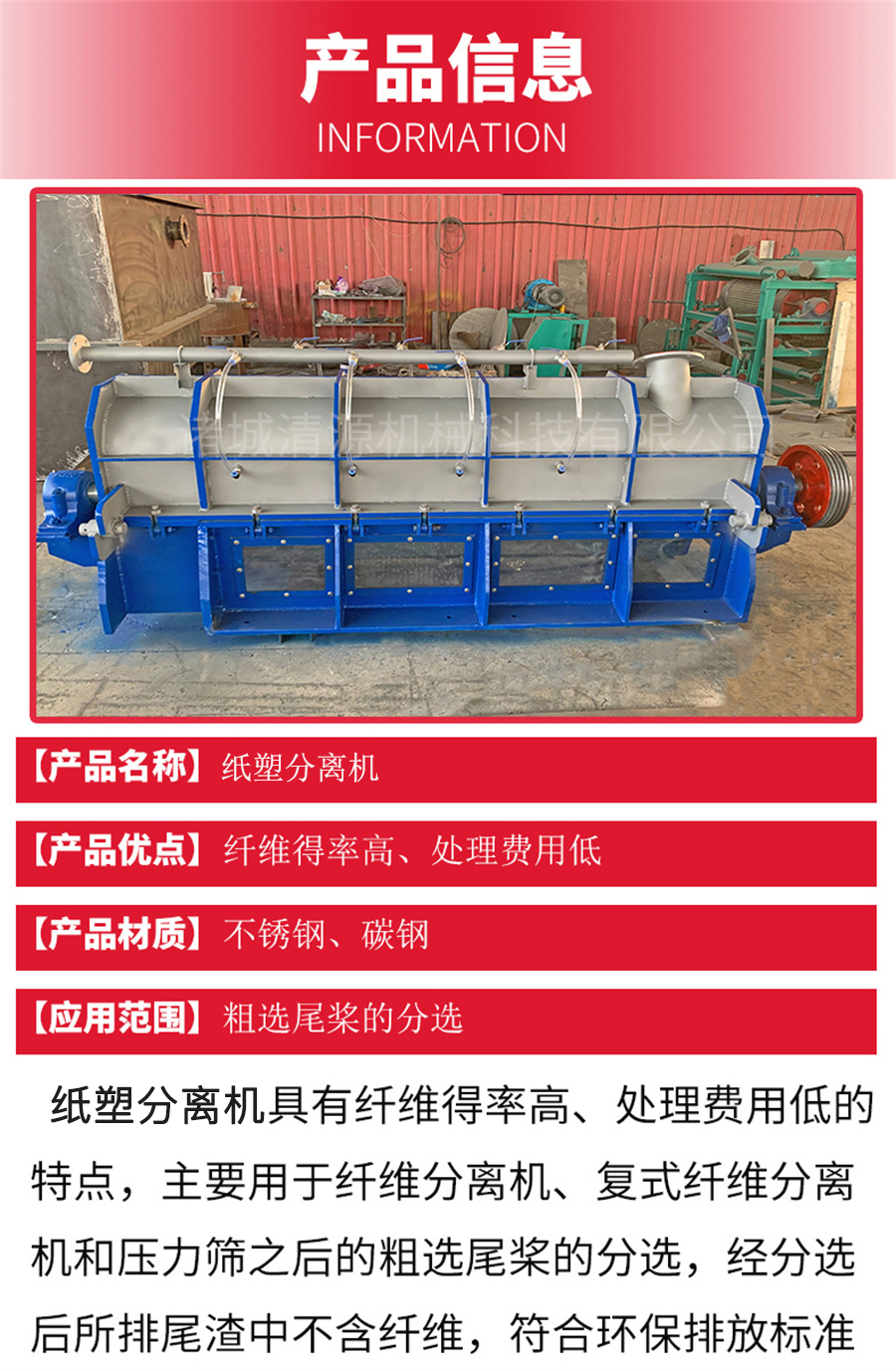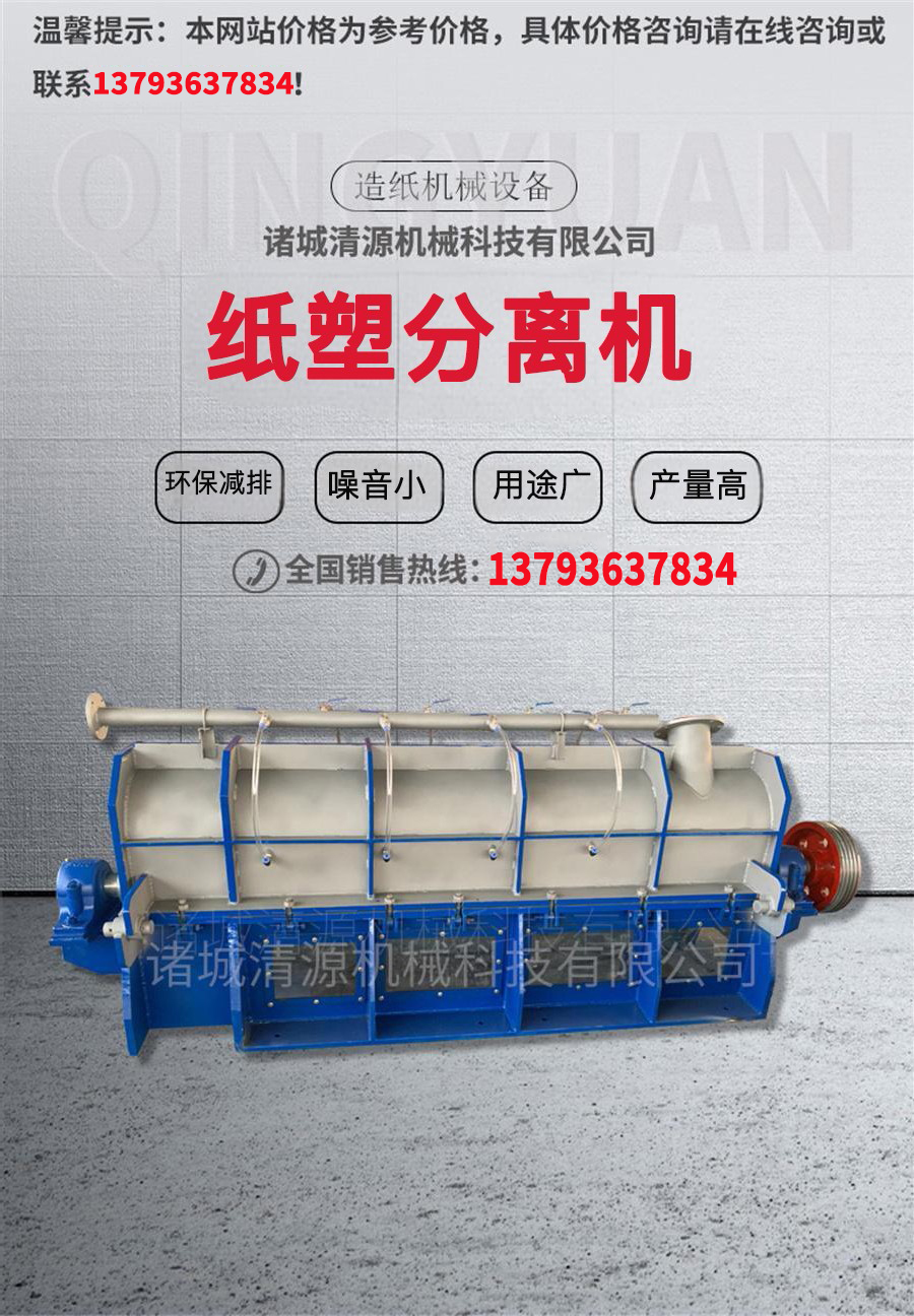 诸城清源机械生产的纸塑分离机包括一焊接的组装主体,主体支撑着筛板、转子、收集槽、渣滓排放槽和支架,它是水平安装的。