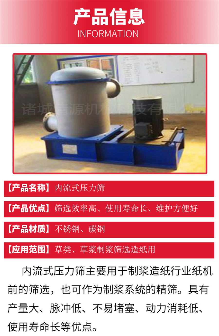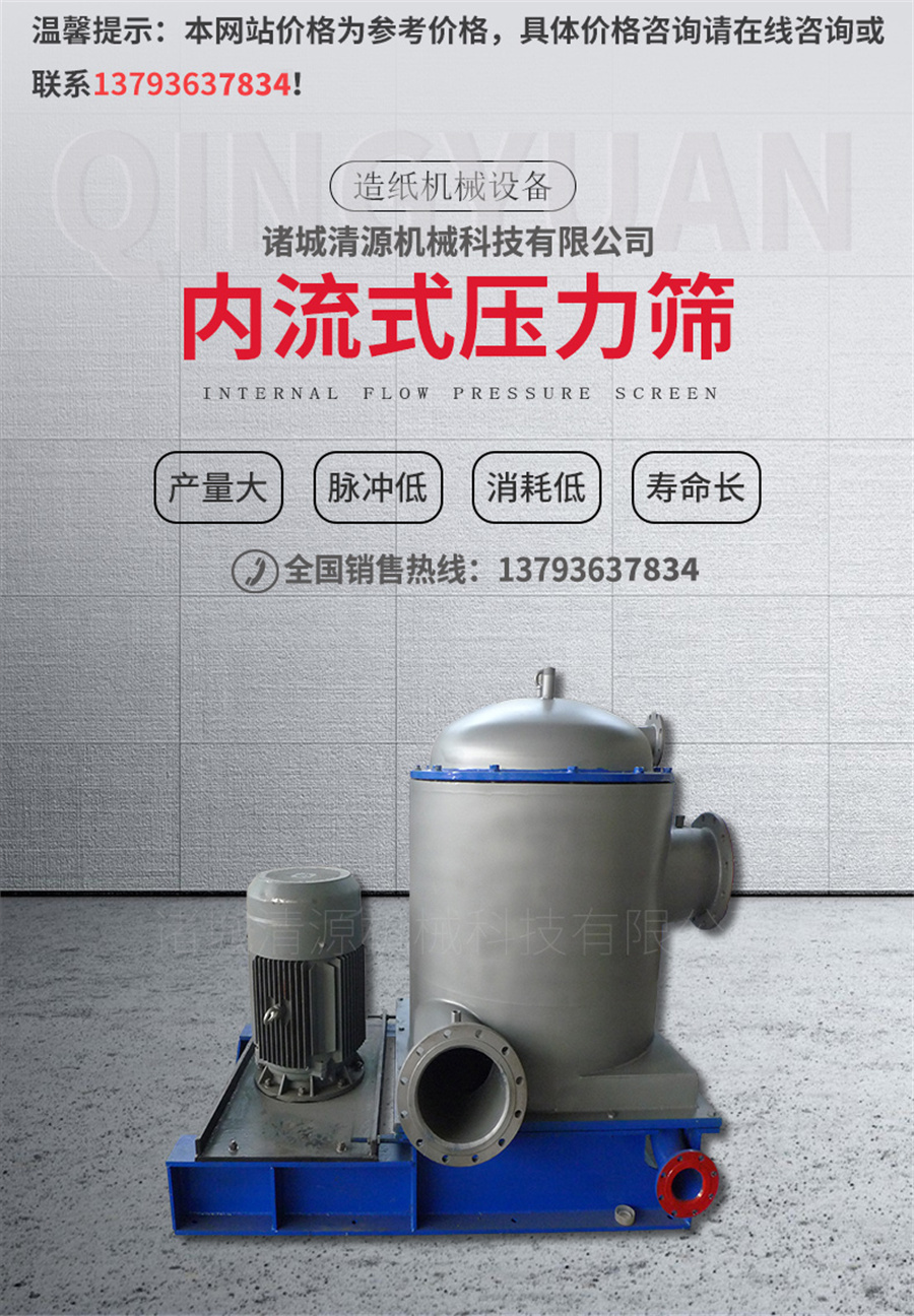 内流式压力筛是当代造纸行业较好的筛选设备。内流式压力筛适用于化学浆、磨木浆及废纸浆的筛选。目前多用于造纸机前的浆料精选,对于提高成品纸的档次,降低能源消耗起着重要的作用。